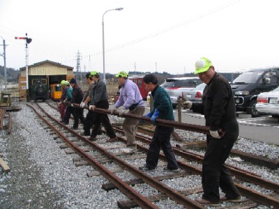 この日の参加者全員でレールの整理移動を行っています。