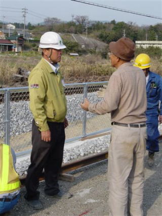 雨の中、バラストを撒く作業員さんたち。みんな親切です。 |