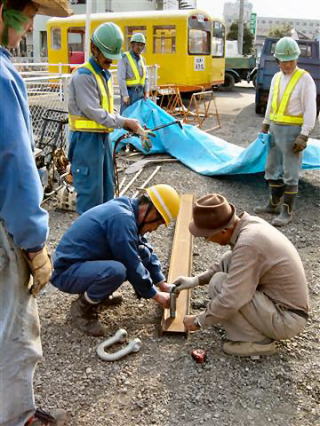 レールについたコンクリートを落とすA氏。物を作ることを生業にする人の姿勢を感じました。 |
