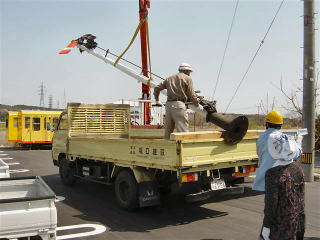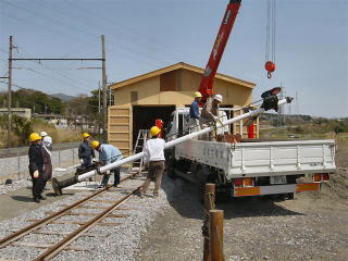 | 腕木式信号機到着。ユニック車へ載せかえ作業。 |