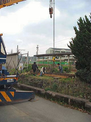 | ターンテーブルの移設工事が始まりました。 三岐の新山氏、ASITAの安藤会長の姿が見えます。 |