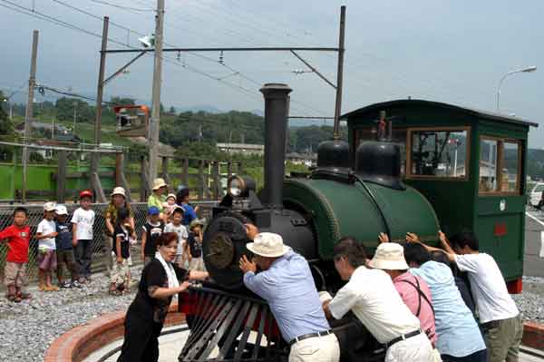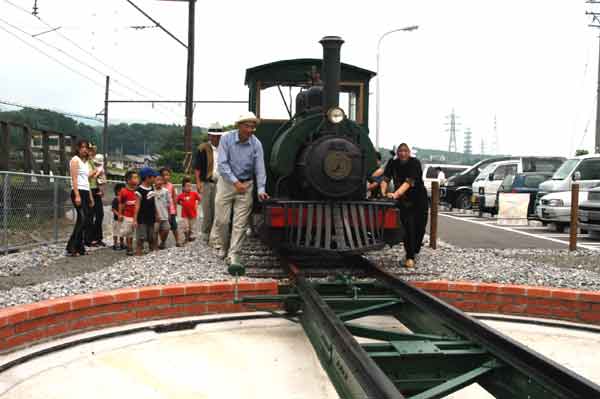 | こどもが見守る中、転車台に入場する下工弁慶号。うまく乗るかな? 以下撮影:K.T氏 |