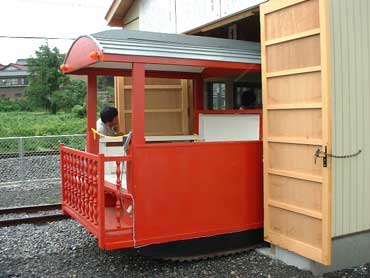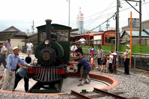 | 記者の要望に合わせ「ウンコラショ、ドッコイショ」。北勢線の運転手も見学しています。 |